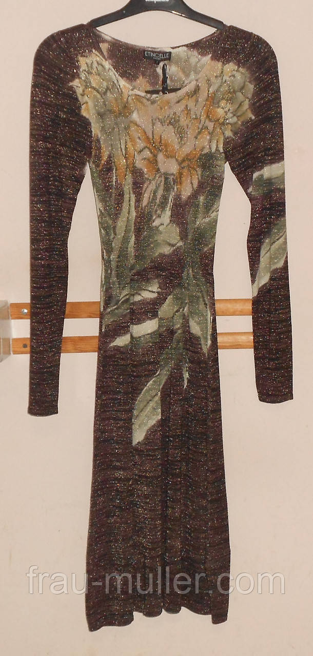 Приталену сукню Etincelle з яскравим малюнком стане улюбленим у Вашій шафі. Легке, дихаюче, комфортне і стильне, воно підкреслить вашу стрункість і не залишить Вас непоміченими. Тони шоколадно-жовто-зелені. Чудовий тематичний малюнок з квітів і листя. Рукав довгий, круглий виріз, з тканини меланж додано трохи люрексу. Розміри міжнародні 36 40 42 44.