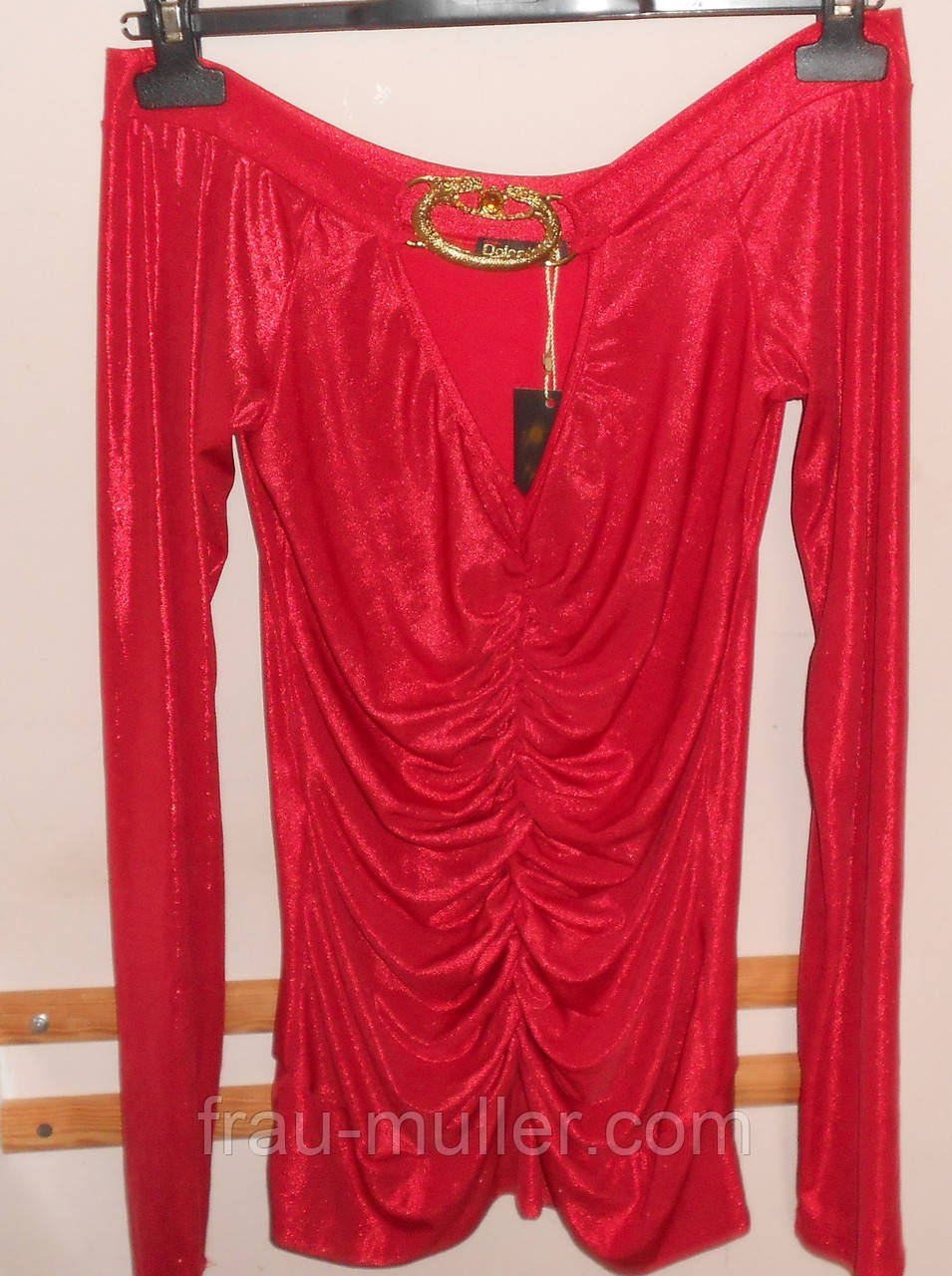 Святкова блуза, призборена по переду, з глибоким декольте, прихваченном брошкою. Рукав довгий, вузький з ефектним манжетом. Стречева тканина яскраво-червоного кольору прикрашена золотим напиленням. Модна і комфортна, стане справжньою окрасою будь-якої вечірки. Розміри європейські 40-42.